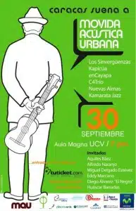 Caracas, 11 de agosto de 2009.- El miércoles 30 de septiembre, a las 7:00 p.m., el Aula Magna de la Universidad Central de Venezuela se llenará de buena música venezolana. Los seis grupos que conforman la Movida Acústica Urbana o MAU -Kapicúa, Los Sinvergüenzas, C4 Trío, enCayapa, Nuevas Almas y César Orozco Kamarata Jazz- se reunirán en un mismo escenario para combinar nuestros ritmos tradicionales con elementos del jazz y de la llamada música del mundo.